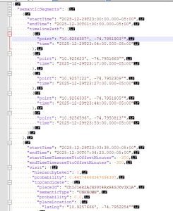 Technical data only. The file exported from Google contains geographic coordinates (latitude, longitude), timestamps, and the detected mode of transport. It does not contain passwords, emails, contacts, or personal messages. It is a list of points on the map, unrelated to your personal identity.